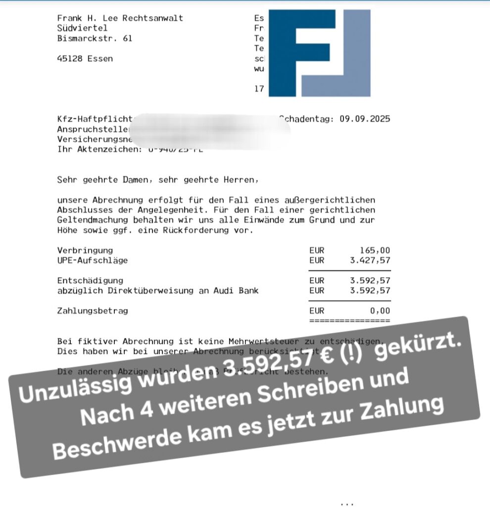nachdem nun – nach weiterer Aufforderung – ein weiterer Teilbetrag zur Auszahlung gelang ist, müssen wir erneut auf die Angelegenheit zurückkommen. Unsere Mandantschaft wird die durch Sie vorgenommenen unzulässigen Kürzungen nicht akzeptieren!