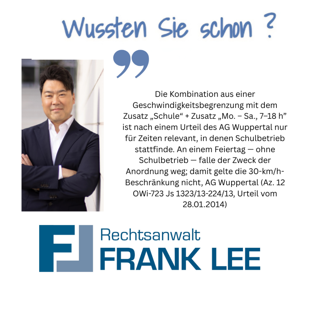 Die Kombination aus einer Geschwindigkeitsbegrenzung mit dem Zusatz „Schule“ + Zusatz „Mo. – Sa., 7–18 h” ist nach einem Urteil des AG Wuppertal nur für Zeiten relevant, in denen Schulbetrieb stattfinde. An einem Feiertag — ohne Schulbetrieb — falle der Zweck der Anordnung weg; damit gelte die 30-km/h-Beschränkung nicht, AG Wuppertal (Az. 12 OWi-723 Js 1323/13-224/13, Urteil vom 28.01.2014)