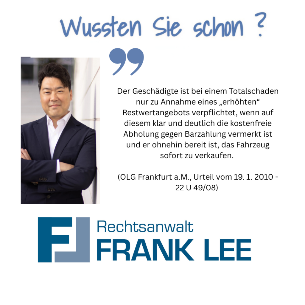 Der Geschädigte ist bei einem Totalschaden nur zur Annahme eines ‚erhöhten‘ Restwertangebots verpflichtet, wenn auf diesem klar und deutlich die kostenfreie Abholung gegen Barzahlung vermerkt ist und er ohnehin bereit ist, das Fahrzeug sofort zu verkaufen.
